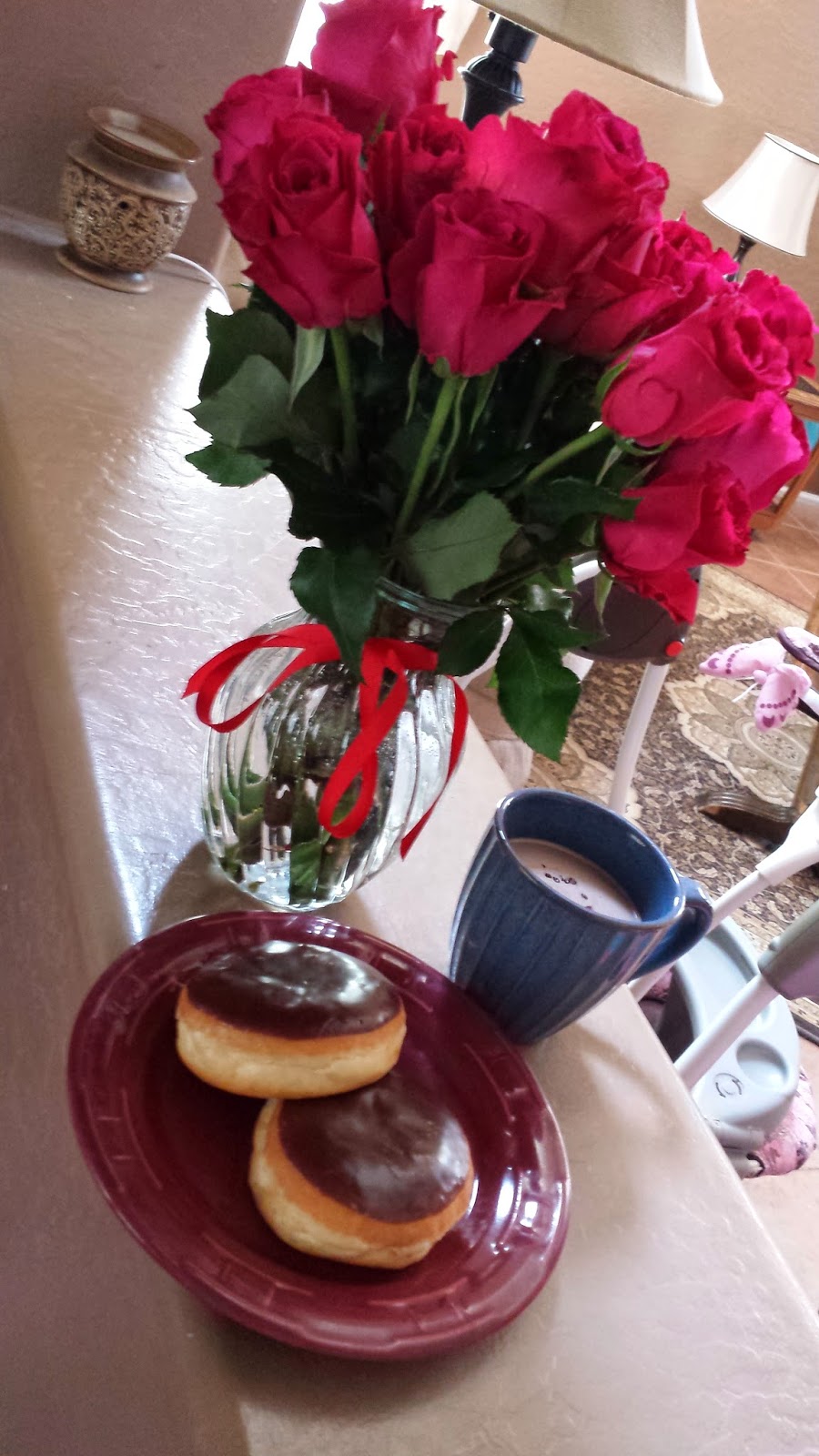 Roses, doughnuts, and dark chocolate hot chocolate with french vanilla creamer. What more can a girl ask for. He truly knows the way to my heart. If not through yarn, you can access my love with doughnuts.